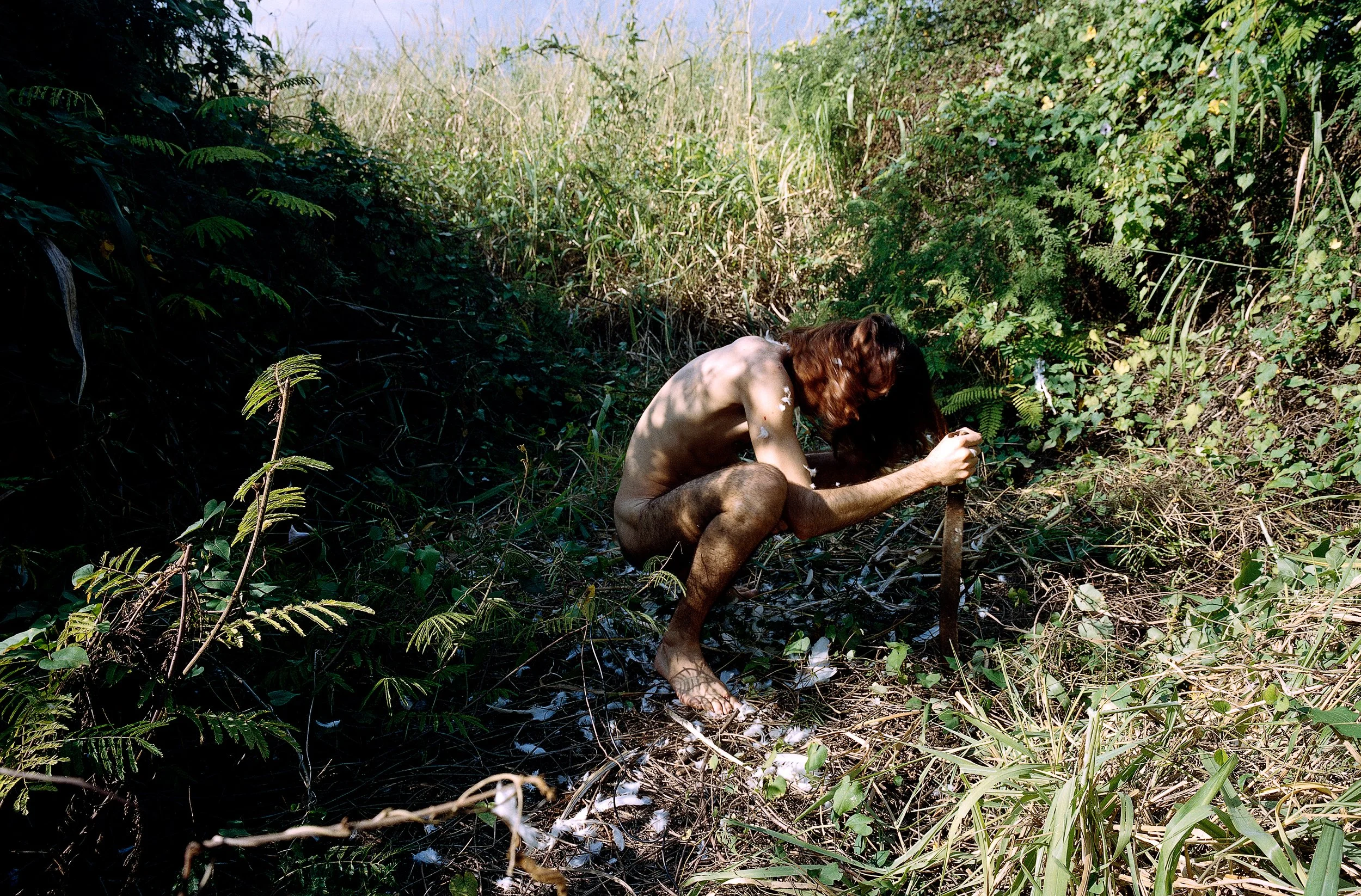 Desplumado, 2018, is a durational performance re-staging forced labor. Nude with white chicken feathers scattered on the ground and on my body, I use a worn out rusted machete to cut through thorn bushes in an isolated field in Güines, Cuba near my fathers home. I attempt to clear the area only to be continuously pricked by the thorns and my sense of place disoriented by ambient sounds. Performing an arbitrary task where I accomplish no form of visible change to the landscape.