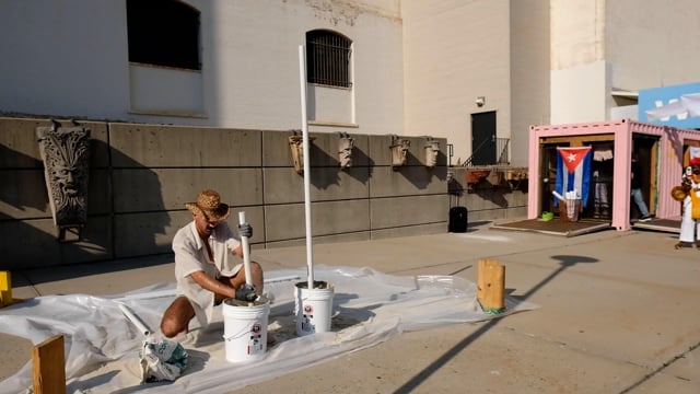 Close-Lines, 2019, is a durational performance constructing a tendedero(clothes line) as a portrait of inherited and created family, memory, and labor. The performance begins by playing a playlist of Latinx/Cuban songs. As the music plays, on a white plastic tarp, I create various pole structures by pouring water and cement and inserting a tube of pvc into the plastic buckets. Each completed pole is then positioned in close proximity to one another, and near a pink storage container, with twine strung inbetween the structures. Then, after submerging photographs printed on silk and personal articles of clothing into a white bucket with water, I hang each piece onto the clothes line. Once the music ends, and the images and clothing are hung, I complete the activation by reciting an excerpt from an interview with my maternal grandmother discussing her relationship with her queer brother and his death.